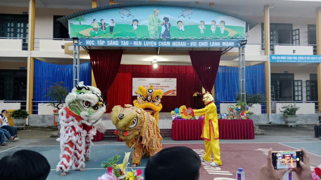 Mở đầu chương trình là những tiết mục văn nghệ sôi động, đậm sắc màu dân gian do các em học sinh biểu diễn. Sân trường rộn ràng hơn với màn múa lân đặc sắc và sự xuất hiện của chú Cuội mang đến niềm vui bất ngờ cho các em nhỏ.